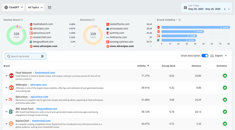 - AI-Recommended Domains: Find out which websites are mentioned next to yours in AI-generated responses.