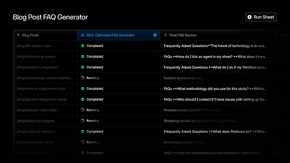 Sheets is the new connective layer for your marketing program. Profound data flows in, Agents do the work, and content flows out to your CMS. Here's what you can build: