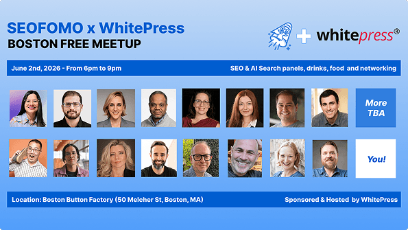 Join the next free SEOFOMO Meetup with WhitePress in Boston featuring SEO trends and AI Search panels, quizzes, giveaways, free drinks, food, and networking on June 2nd, 2026 from 6pm to 9pm.