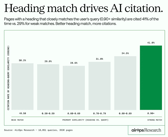 Pages with headlines that directly answer the question get cited 41% of the time. Pages with loosely related headlines drop to 29%.